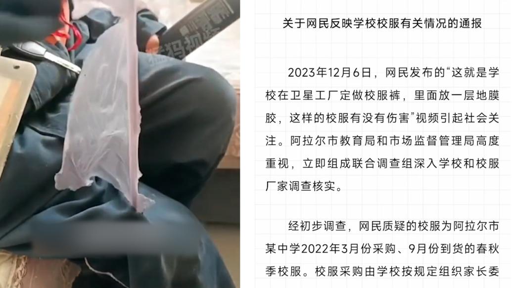 新疆阿拉尔官方通报校服裤夹层扯出疑似塑料膜:系脱落的校裤内部复膜…=,已送检。
