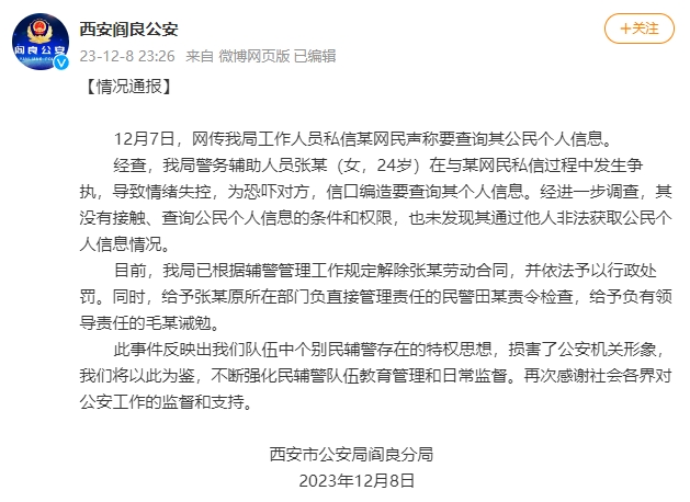 西安阎良公安通报警务辅助人员称要查网友个人信息▽•:解除劳动合同,予以行政处罚。