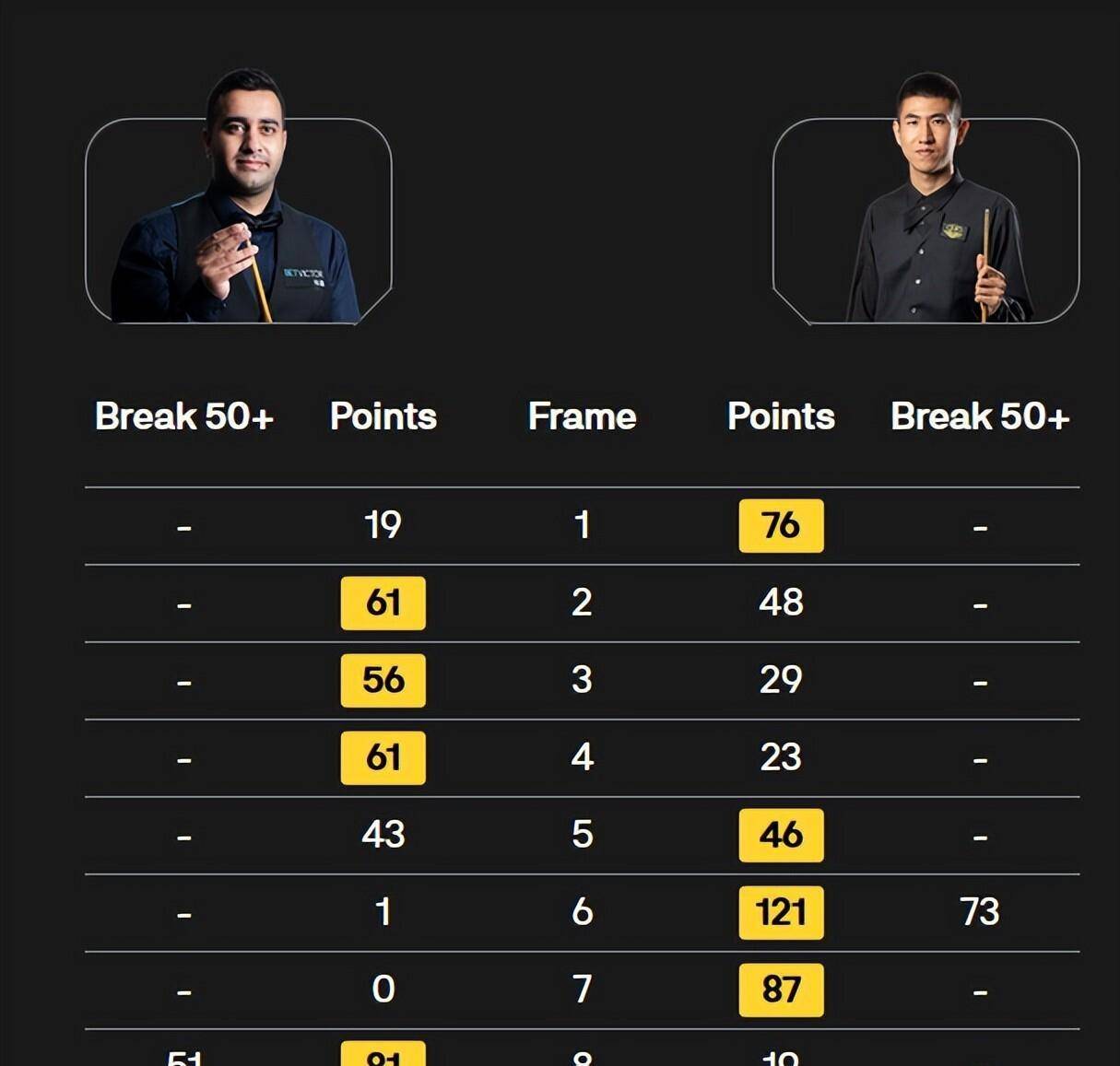 第六局,虽然没再打出高分,但80比21的比分足够说明一切。5比1■◆,傅家俊赢得相当轻松。别忘了,就在上个月▽=,他还在一场表演赛里赢了丁俊晖■▷-。这位中国香港名将的手感,看来是热得发烫。