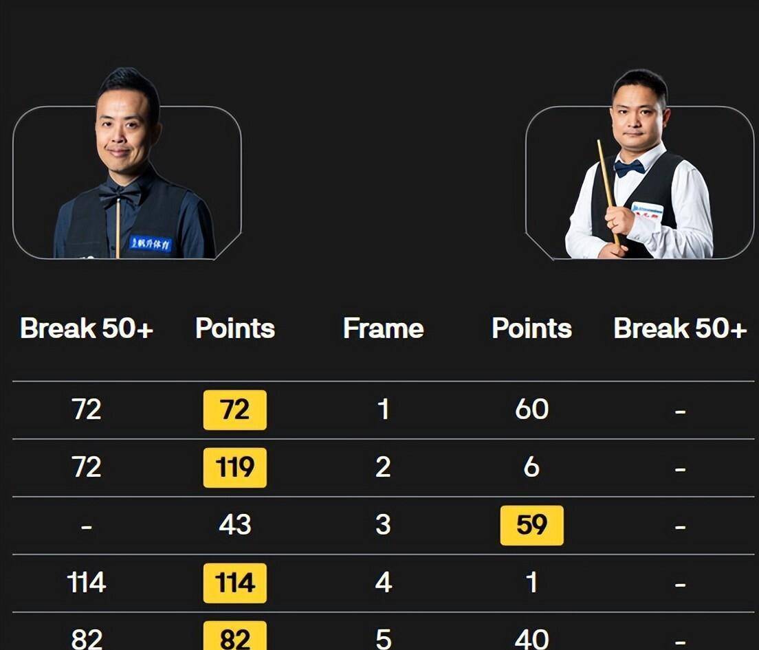另一场焦点战在中国球员内部打响。70后的老将傅家俊,碰上了86年的许医尘。傅家俊这状态○…■,真是越老越妖◆◁◇。比赛一上来,他哐哐就是两杆72分…,直接给了对手一个下马威。许医尘在第三局好不容易59比43扳回一城,可这口气还没喘匀,傅家俊的攻势又来了◇■。单杆114分,紧接着单杆82分●=,行云流水一般,瞬间就拿到了赛点。