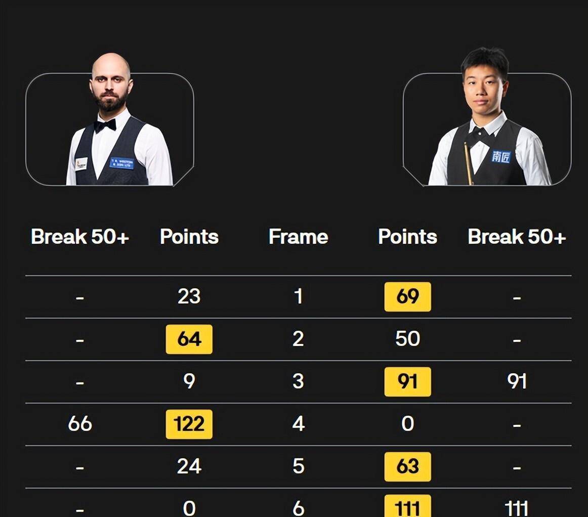 整场比赛,两人进攻都打得磕磕绊绊○,加起来就只有一杆50 ▽◇□,场面碎得让人着急●◁。刘文炜作为职业赛新人,第一次亮相显得有些紧张,以2比5输给了打出单杆102分的齐津斯,算是交了笔学费。