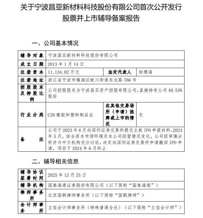 近日,宁波昌亚新材料科技股份有限公司(下称“昌亚股份▪▽”)提交的公开发行股票并上市辅导备案的申请,被宁波证监局受理,备案时间为2025年12月29日。